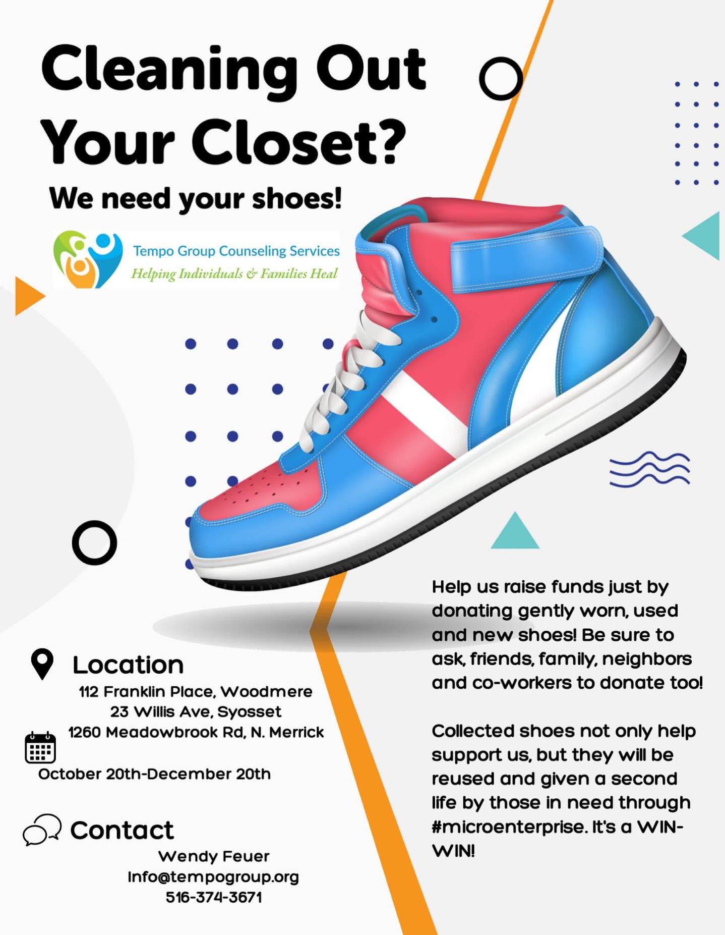 Tempo Group Counseling Servicesis collecting gently used shoes. The collection helps support Tempo and distributes shoes among those in need. Drop off location at 23 Willis Avenue, Syosset until December 20th. Contact Wendy Feuer with questions at info@tempogroup.org or 516-374-3671.